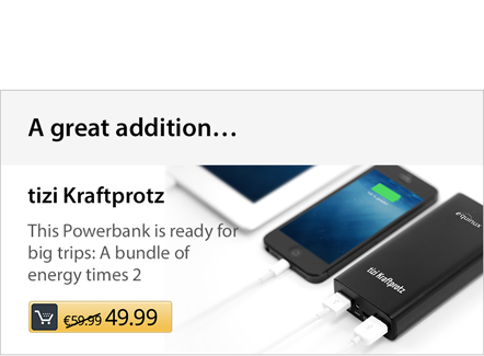 The travel survival kit for your gadgets - the ultra slim powerbank tizi Flachmann. This elegant USB battery is always ready for your full-power adventures.